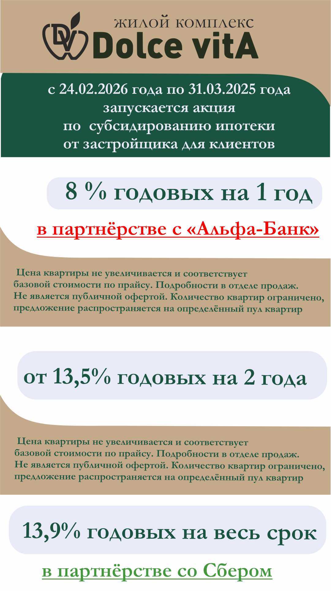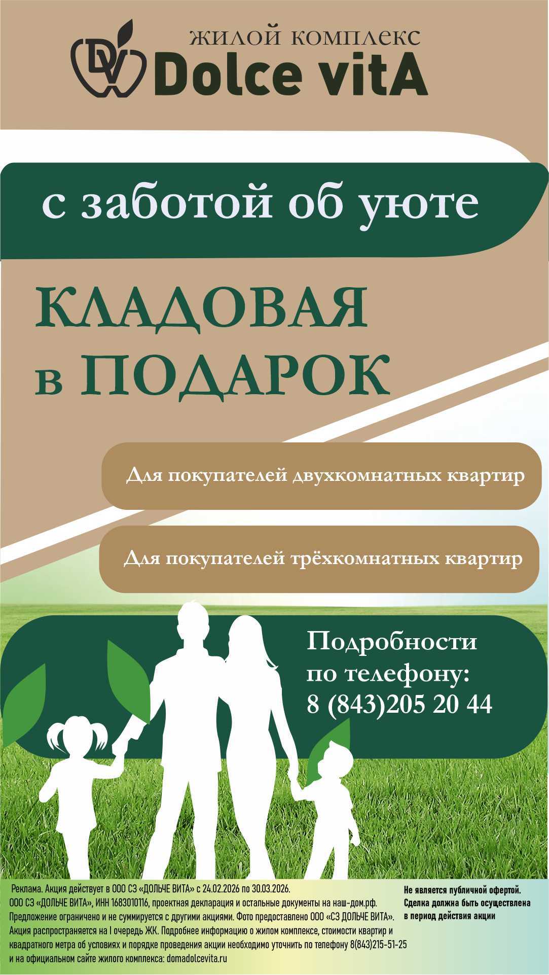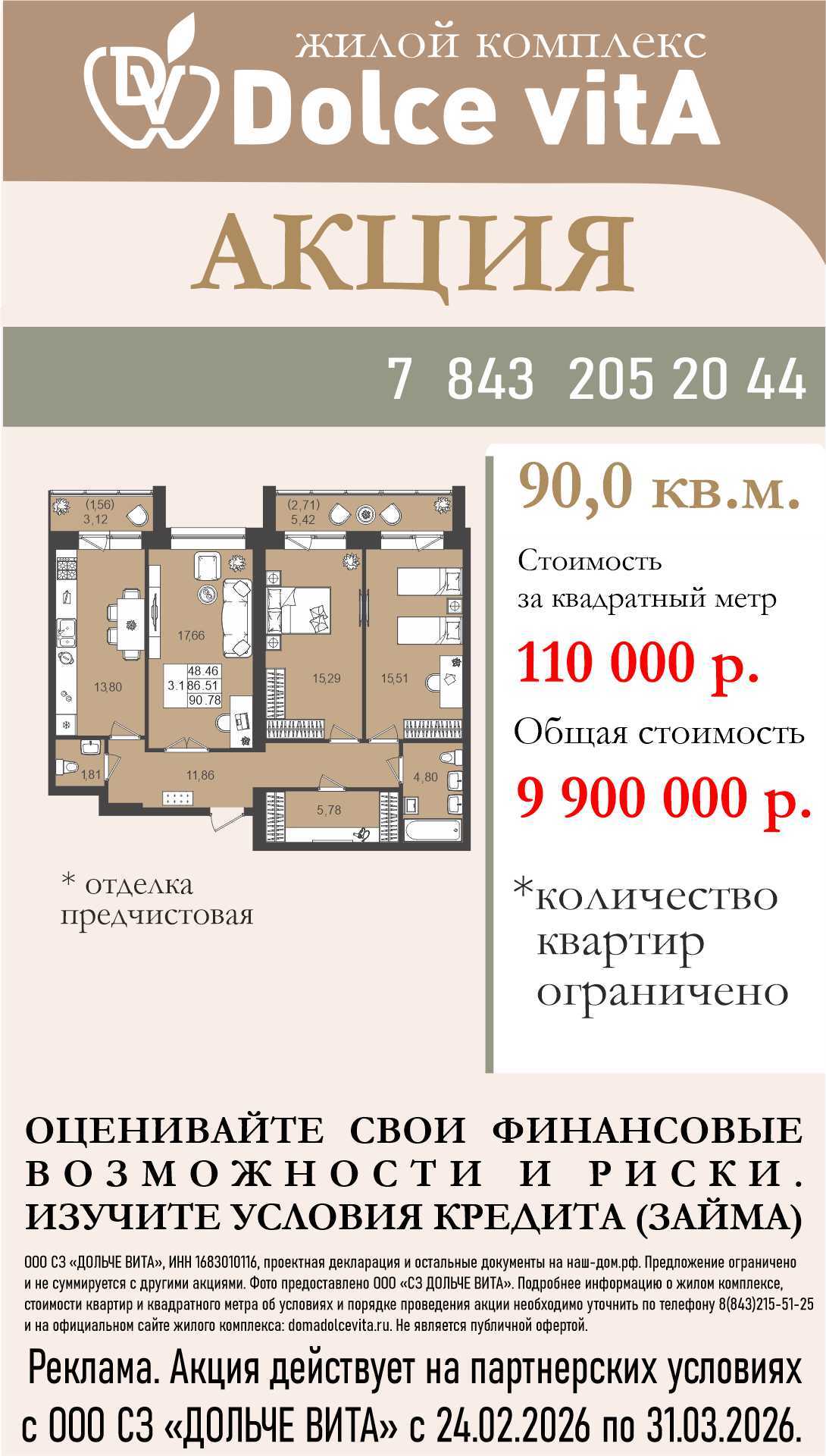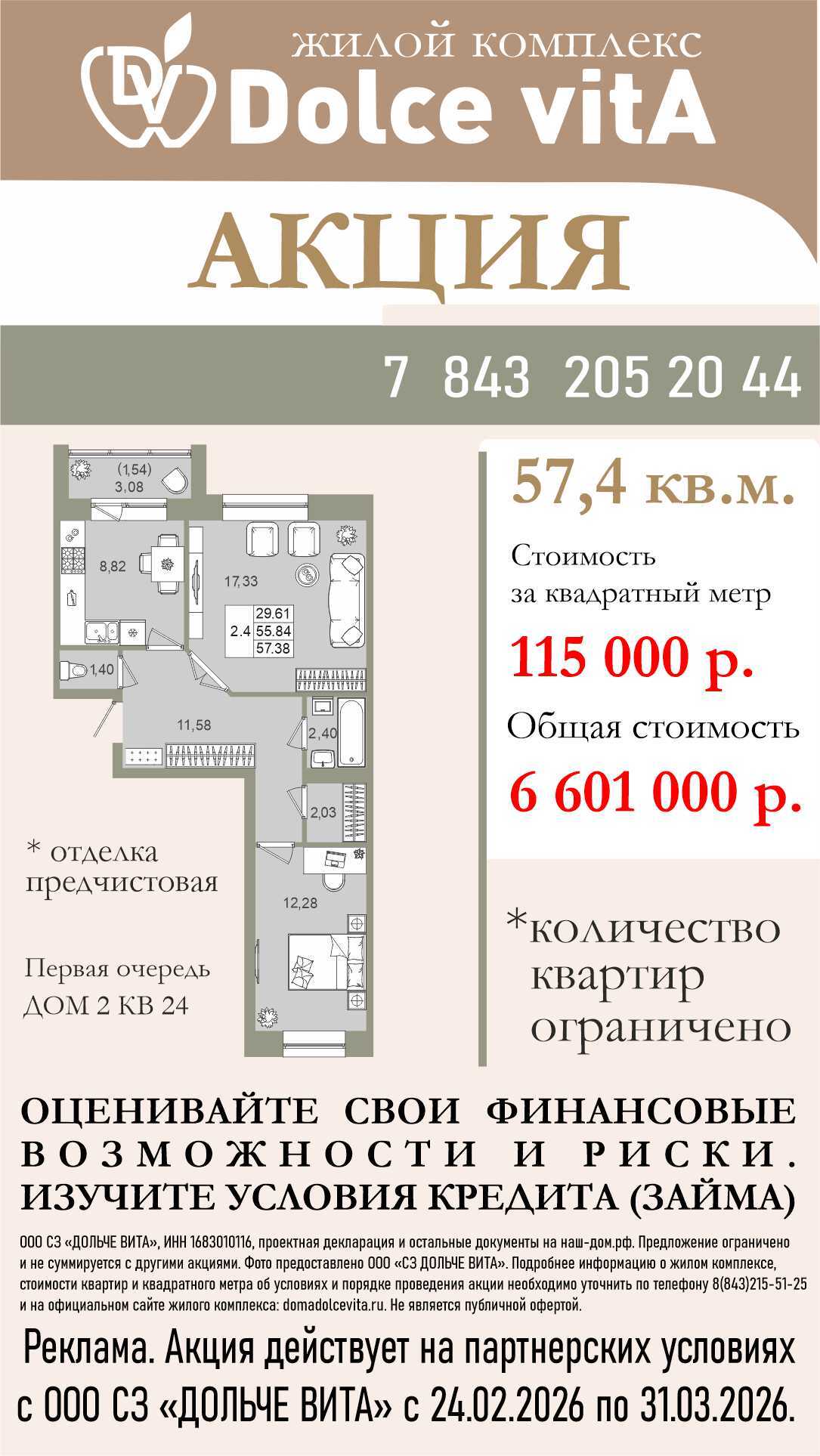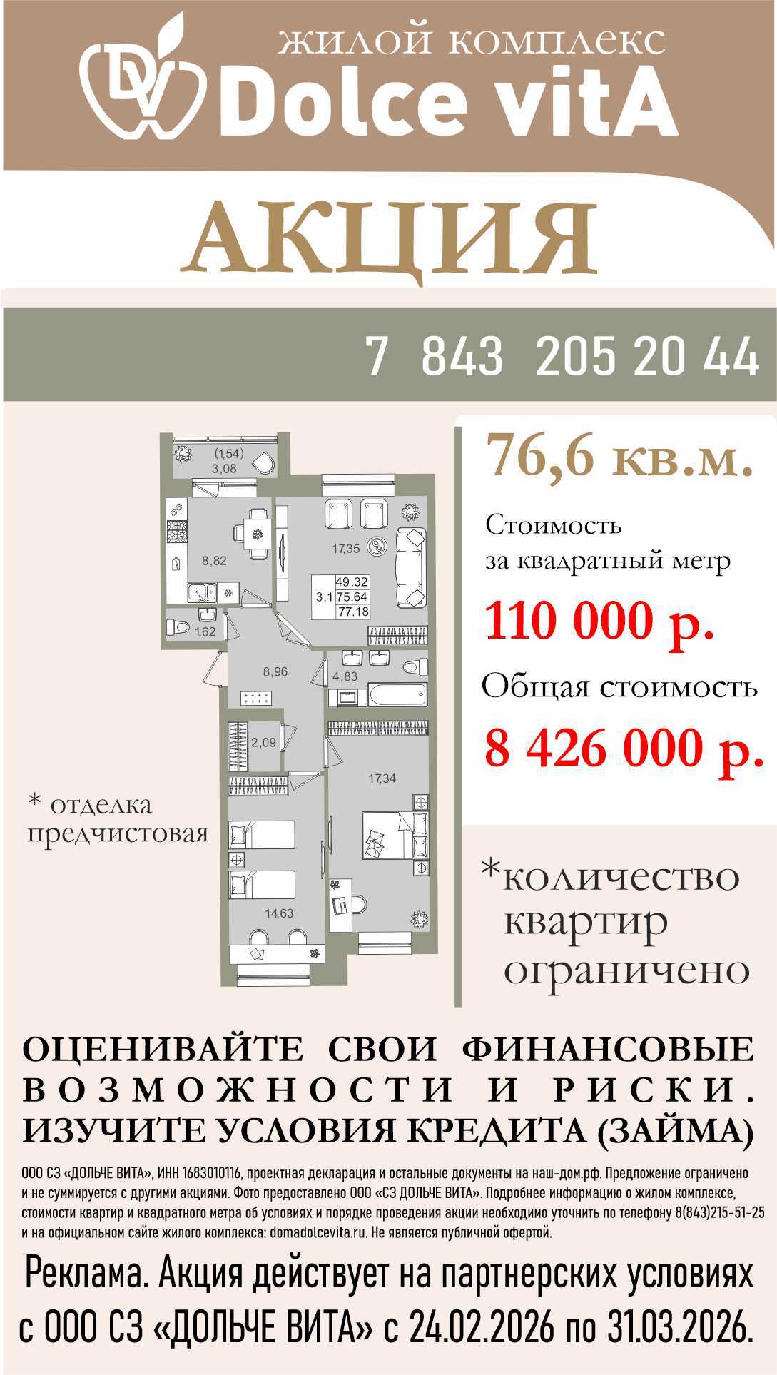 Условия акции: Срок действия акции с 24 февраля 2026 года до 31 марта 2026 года Не является публичной офертой. Распространяется только на КВАРТИРЫ ВО ВТОРОЙ ОЧЕРЕДИ ЖИЛОГО КОМПЛЕКСА. Предложение действует на определенный пул квартир. Оценивайте свои финансовые возможности и риски. Изучите условия кредита и займа. Все подробности по телефону отдела продаж: 8 843 205 20 44.